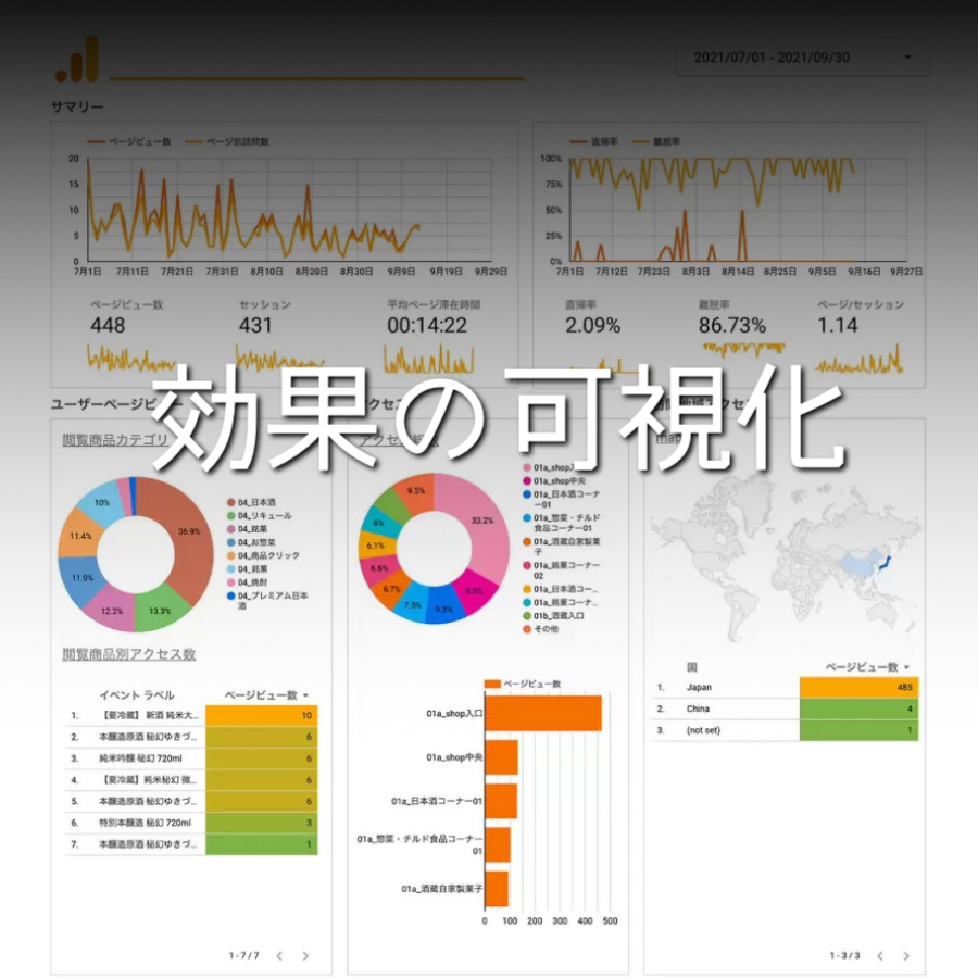 サイト内に拠点箇所や商品などの各種にGoogleアナリティクスを埋め込み、アクセス数やユーザー行動などの分析が可能です。